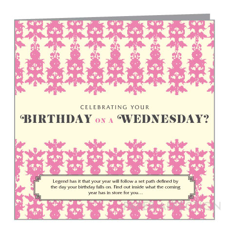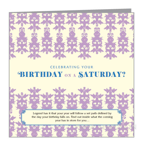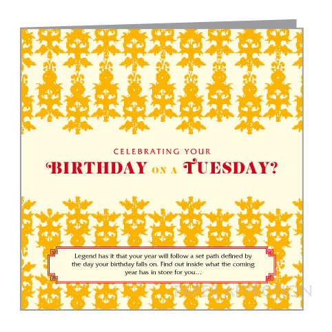 | Legend has it that your year will follow a set path determined by the  day your birthday falls on. A printed prediction features on the inside  of these delightful eastern-style birthday cards.  |  |  |  |  |